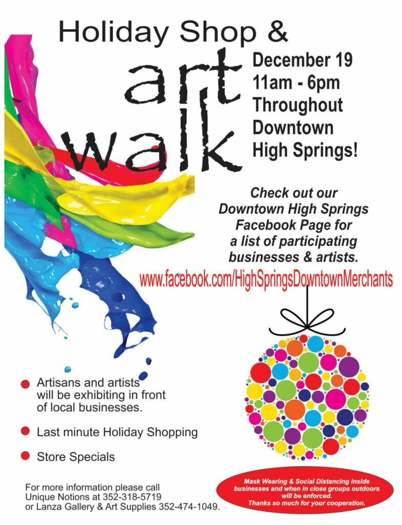 Downtown High Springs merchants will present the 2020 Holiday Shop & Art Walk on Saturday, December 19th from 11am to 6pm throughout historic downtown High Springs. […]
