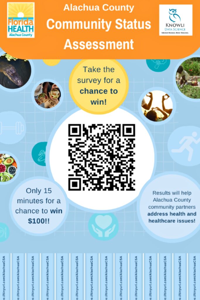 The survey is available online through Jan. 1, 2024, at https://tinyurl.com/AlachuaCSA or by scanning the QR code that accompanies the flyer. A paper version is also available upon request at info@knowli.com and will be available in English, Spanish and Creole. Knowli is the Tallahassee-based research, analytics and consulting company that is conducting the Alachua County survey.