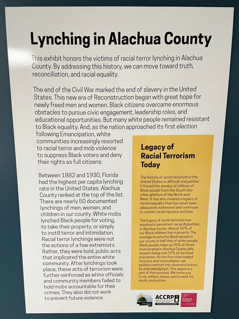 The exhibit came out of the Alachua County Community Remembrance Project that started in 2020. Since then, many subgroups across the county have met, located lynching sites, held soil collection ceremonies and continued the Truth and Reconciliation process.