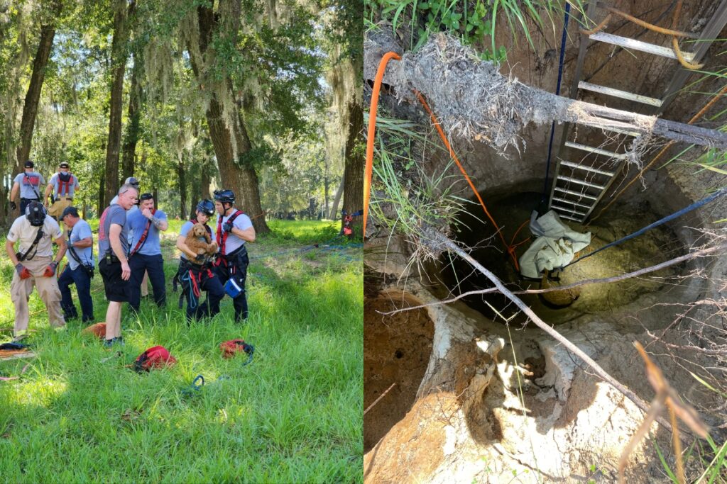 “At 10:21 AM High Springs Firefighters arrived on the scene of a 15-foot-deep sinkhole that had opened up a few days earlier inside a stormwater retention basin, with an 11-week-old Labradoodle puppy trapped, but uninjured, at the bottom of the hole,” the High Springs reported said.