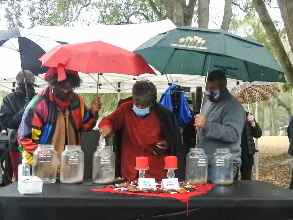 On Friday dozens of local residents gathered in the rain to remember the Newberry 6 and other lynchings under the oaks where they likely occurred. The city of Newberry, the Concerned Citizens of Newberry, the Rosewood Foundation and the Equal Justice Initiative (EJI) combined to organize the soil collection ceremony.
