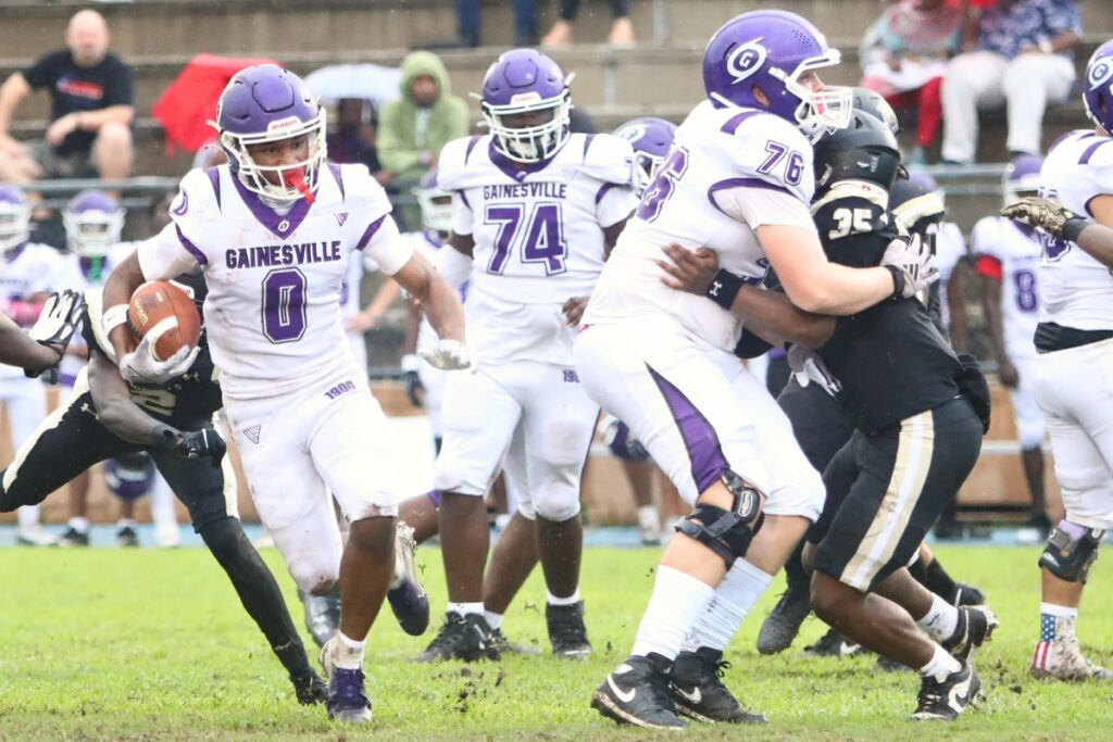 Photo by C.J. Gish Gainesville’s Devin Johnson (0) with a run against Buchholz on Monday.