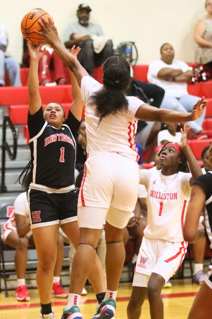 Williston's Janiyah Span (14) puts up a shot against Hawthorne. Photo by C.J. Gish