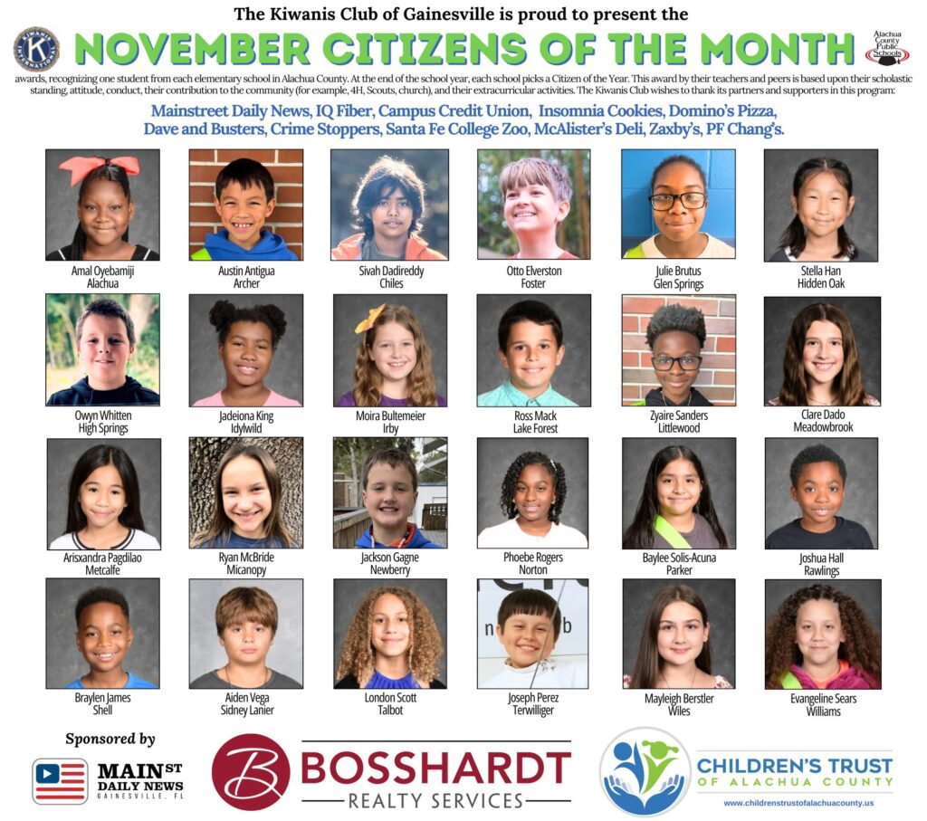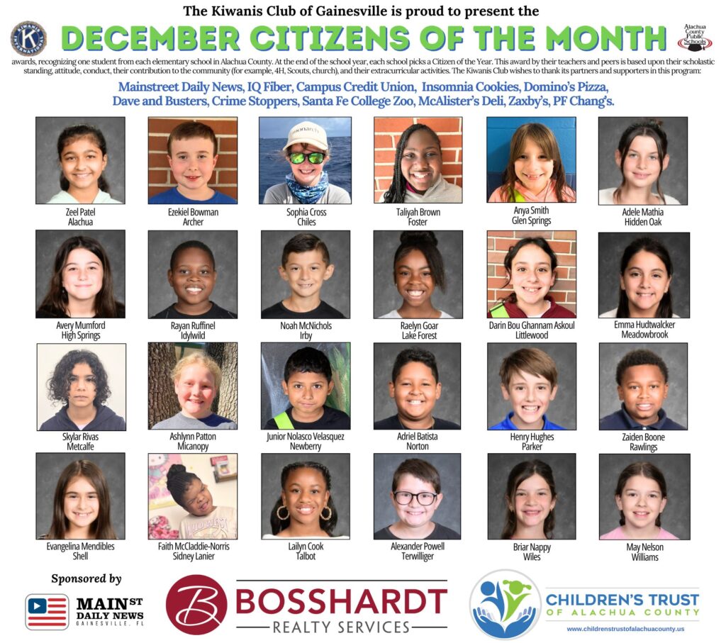 Awards recognizing one student from each elementary school in Alachua County Sponsored by Children's Trust of Alachua County, Clay Electric Cooperative, and Bosshardt Realty.